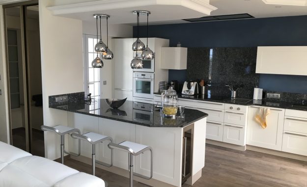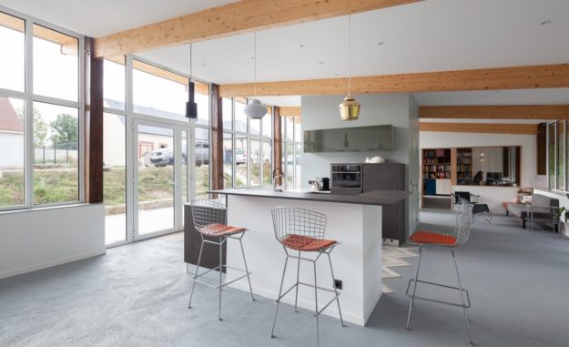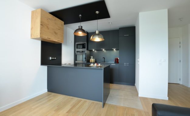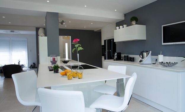 Découvrez cette superbe cuisine ouverture sur le séjour. Les deux espaces fusionnent parfaitement notamment grâce au sol identique, un carrelage imitation parquet.