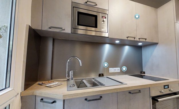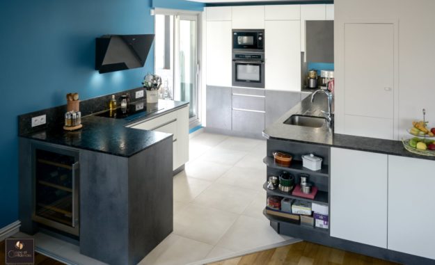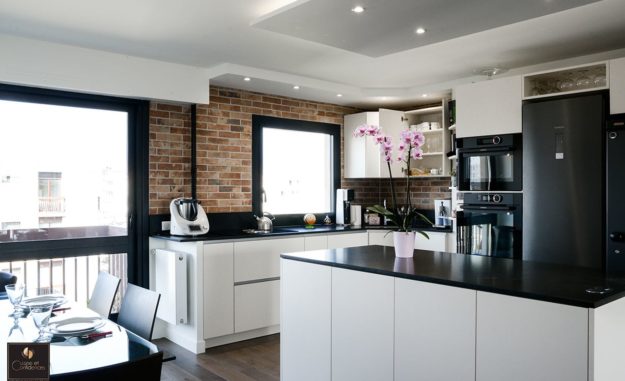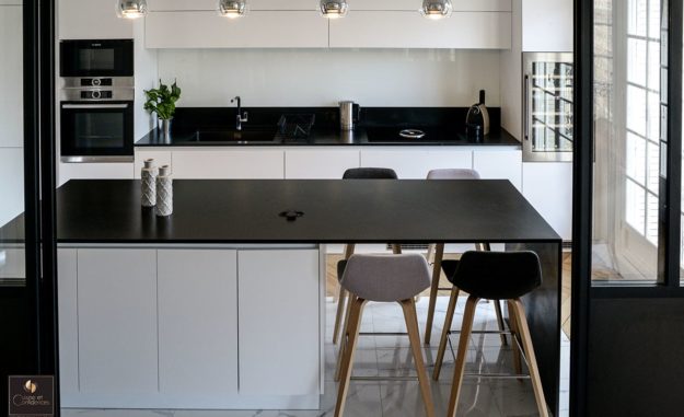 Une verrière coulissante s’ouvre sur cette magnifique cuisine aux lignes épurées. Parfaitement mise en valeur dans ce très bel appartement parisien avec vue sur la Tour Eiffel, cette cuisine se fond toute en finesse avec la décoration très actuelle.