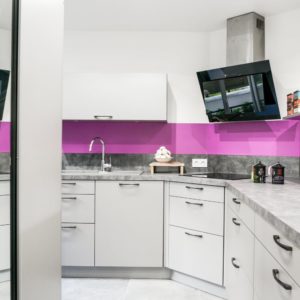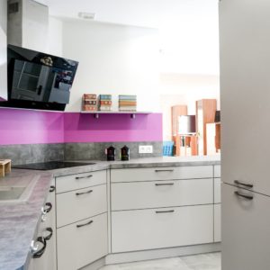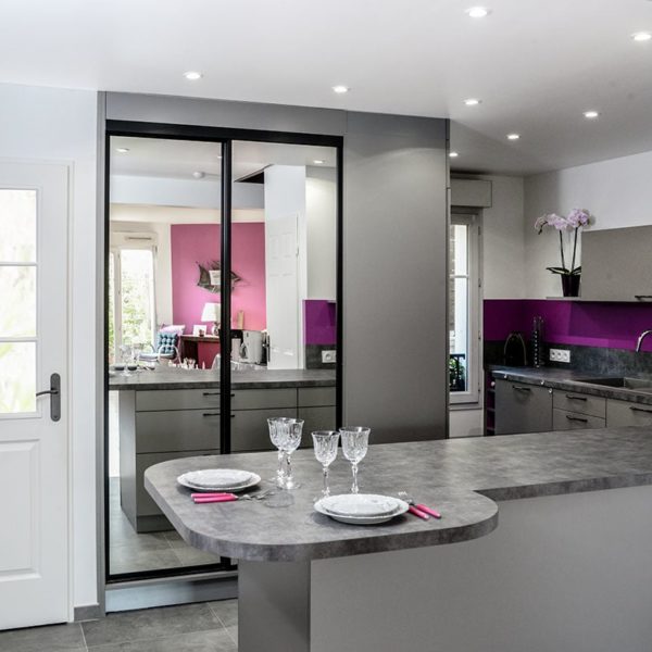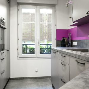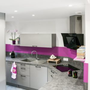 Envie d’une couleur audacieuse ? Le Violine vient égayer cette cuisine grise effet inox avec poignée chromée noire. Personnalisée à 100%, avec son plan de travail Stratifié effet Acier Oxyde, elle s’ouvre sur le séjour par un coin repas aux formes arrondies.