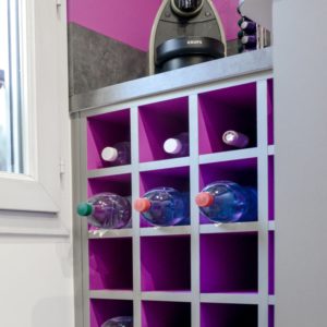 Les niches bouteilles viennent astucieusement compléter un agencement très réussi et complet réunissant l’évier, la cuisson en angle et un grand plan de travail.