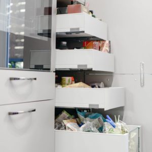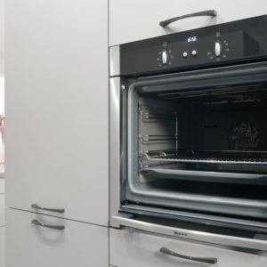 Le mur d’armoire, jusqu’au plafond, accueille le réfrigérateur intégré, des coulissants intérieurs et l’astucieux four avec porte rentrante Slide and Hyde.
