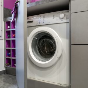 Petit plus Cuisine et Confidences, intégration d’un lave-linge pose libre caché derrière une porte.