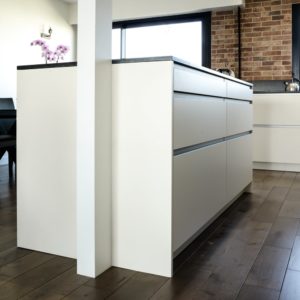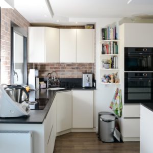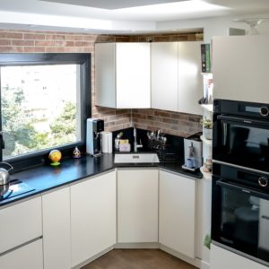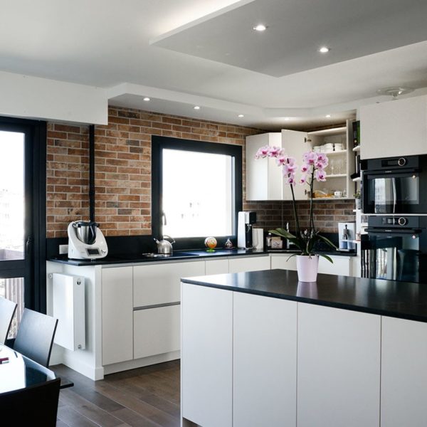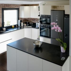 L’ajout de brique au mur apporte ce style atelier accompagné par les façades de meubles coloris Magnolia avec poignée profil inox. Toujours dans la recherche de matériaux résistant à toute épreuve, le choix du plan de travail s’est porté sur un granit noir du Zimbabwe effet cuir.